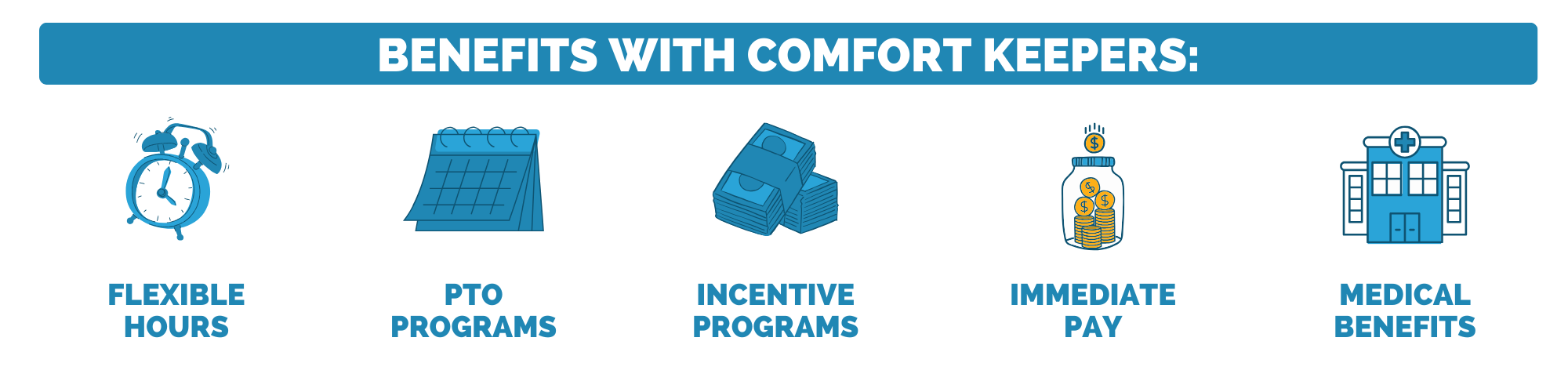 Our caregivers qualify for an expansive selection of benefits, such as flexible scheduling, competitive pay, and a supportive work environment where your experience while working here matters. We also offer paid time off, direct deposit payments, and immediate pay programs to help ensure that you continue to have a fulfilling and worthwhile career while working for Comfort Keepers.